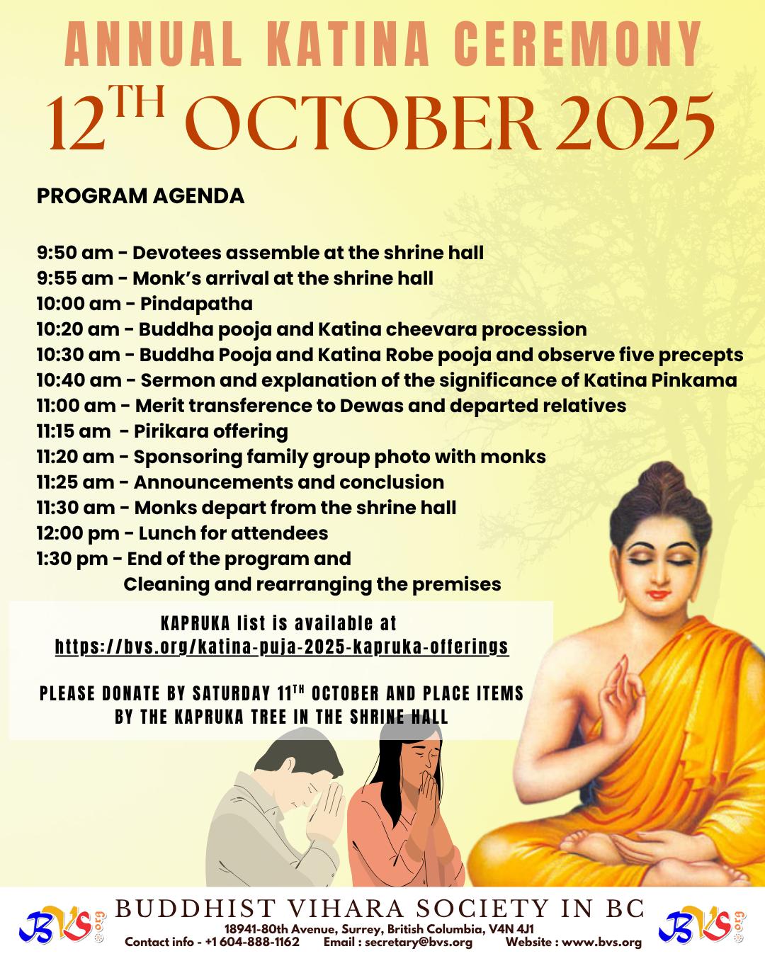 The "Maha Kathina Cheevara offering Ceremony" will be held at the temple premises on Sunday, October 12th, 2025 at 9:50 a.m.